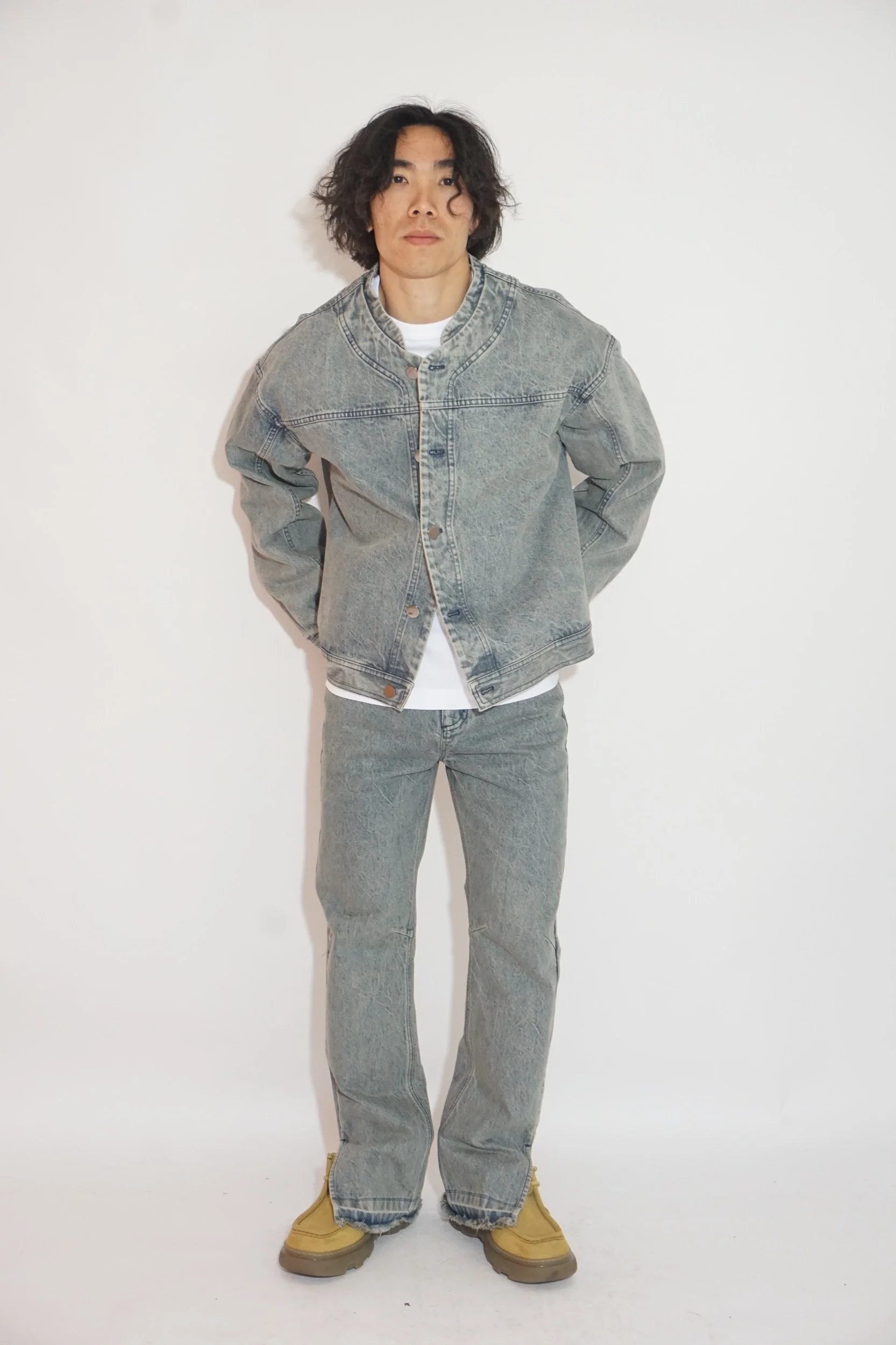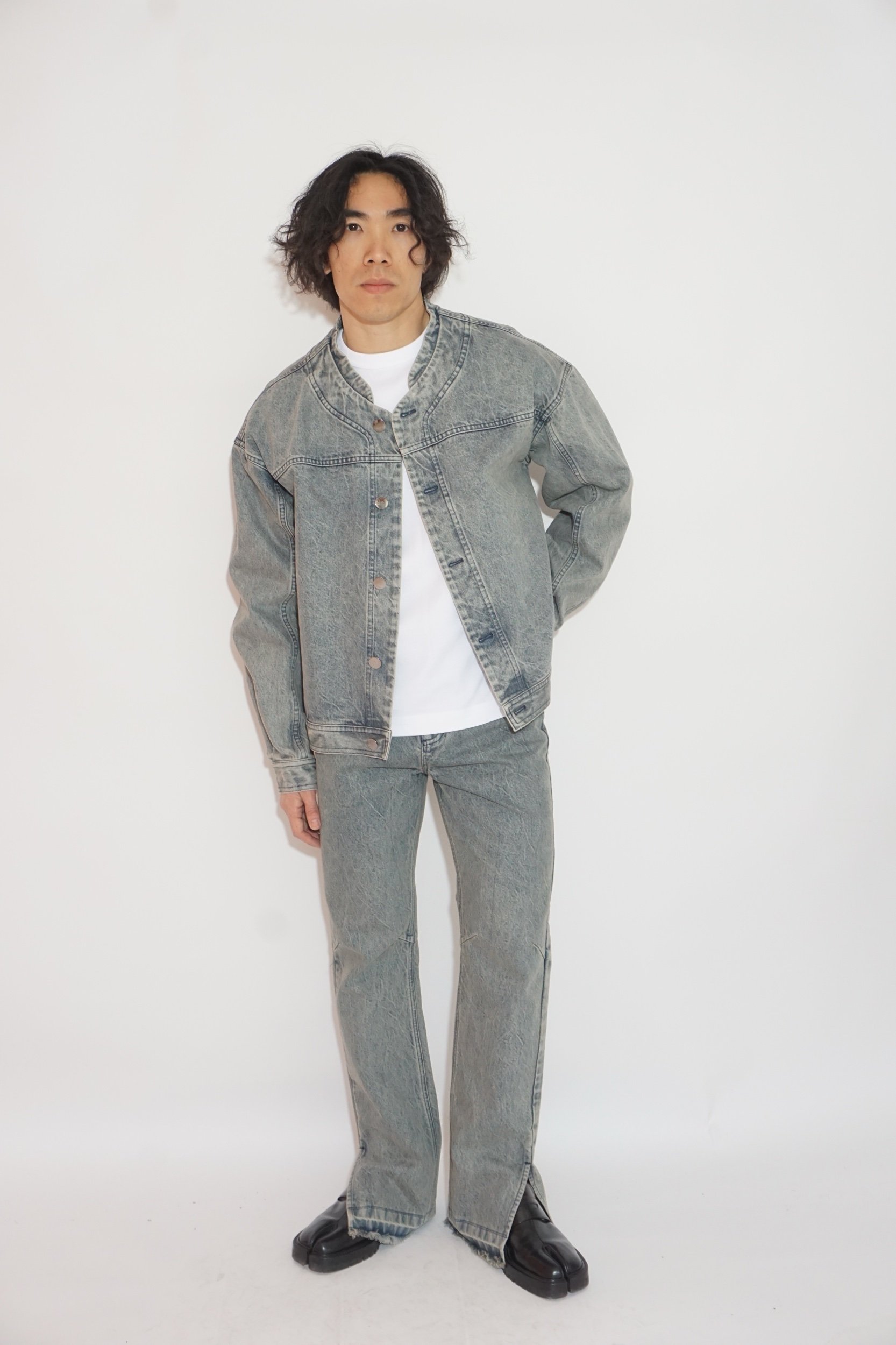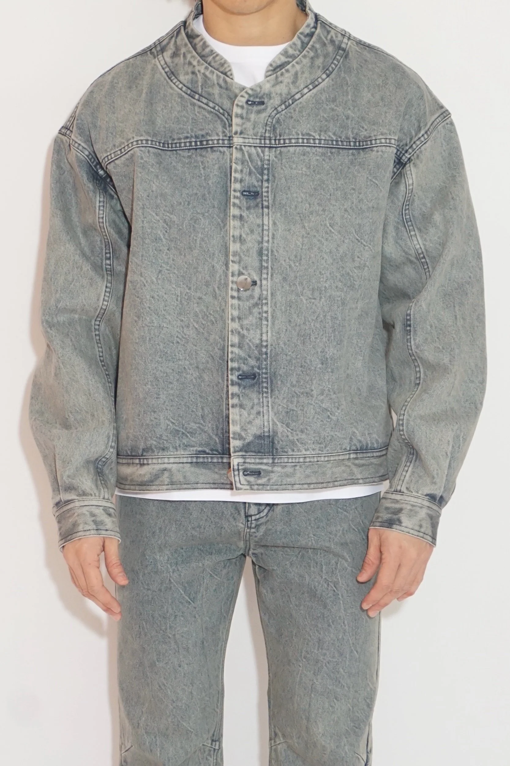 This round-neck washed denim jacket showcases a vintage-inspired light blue hue, crafted with a specialized distressing technique for a soft, worn-in aesthetic. The design is elevated with subtle detailing, including round metal buttons in a sleek gunmetal finish, offering a modern contrast to the classic denim silhouette. Perfect for casual styling, it combines timeless appeal with effortless comfort.