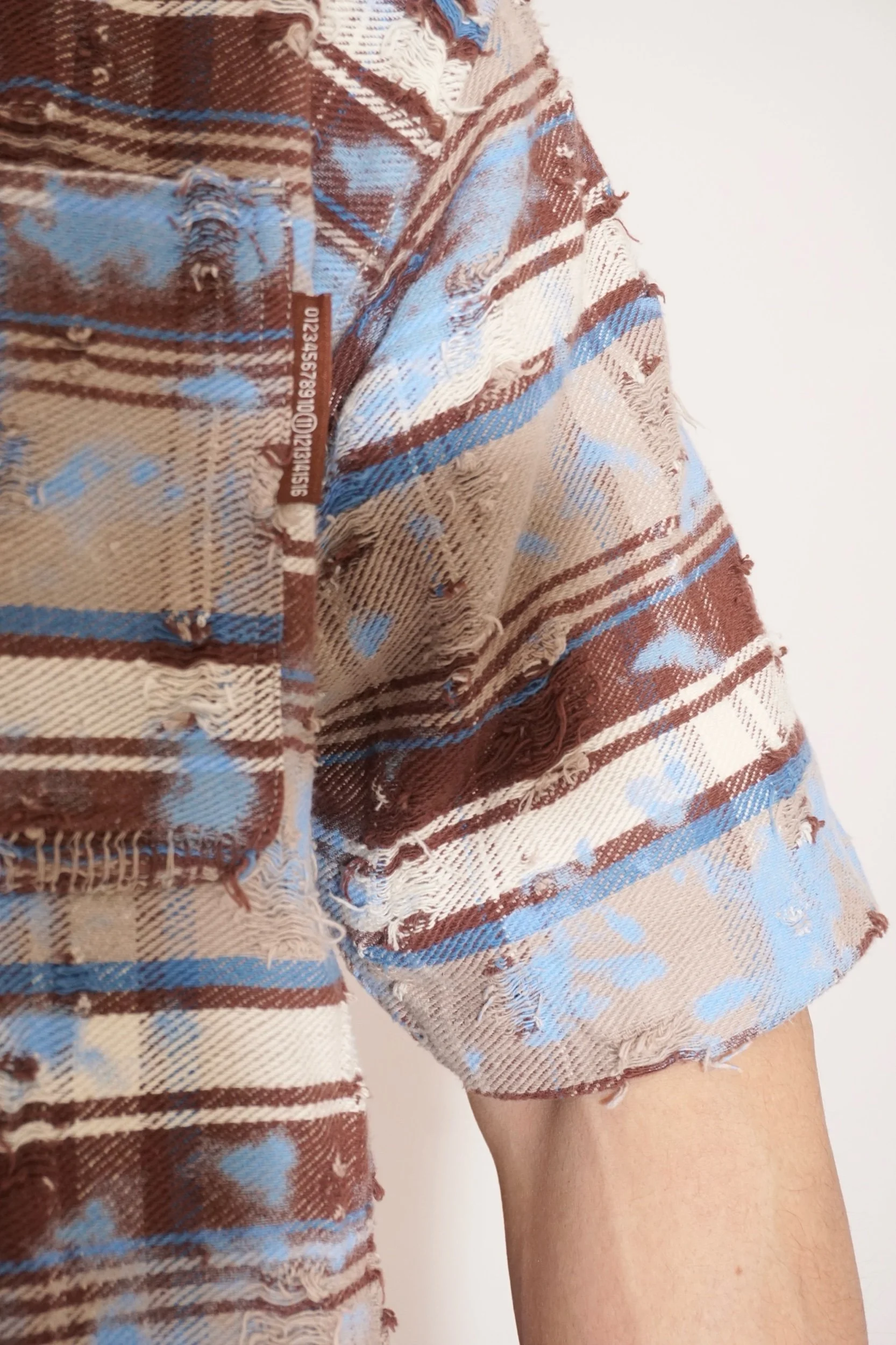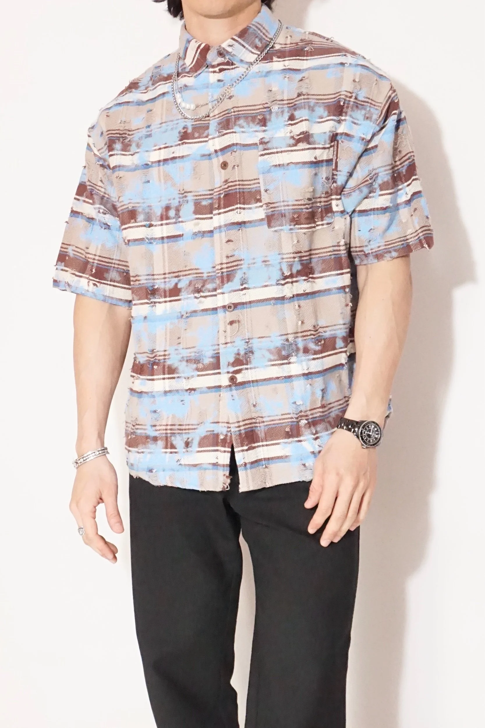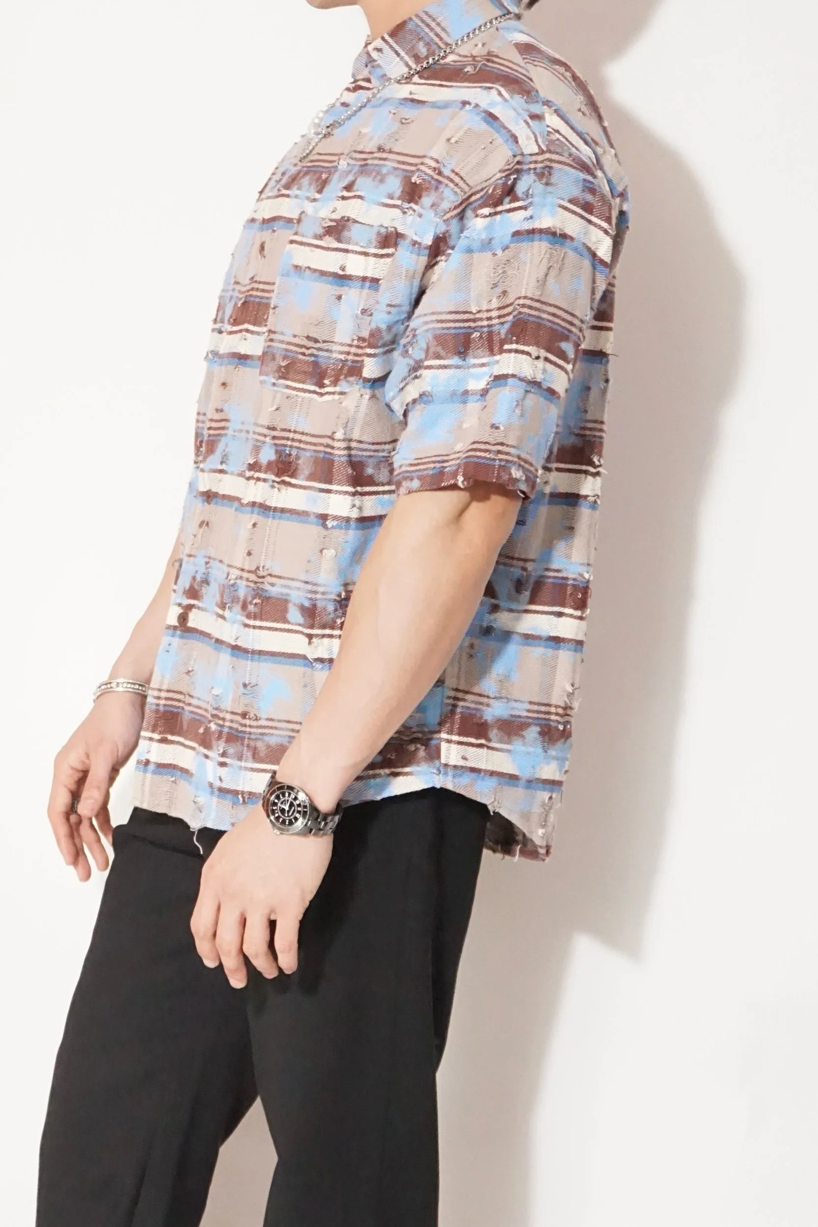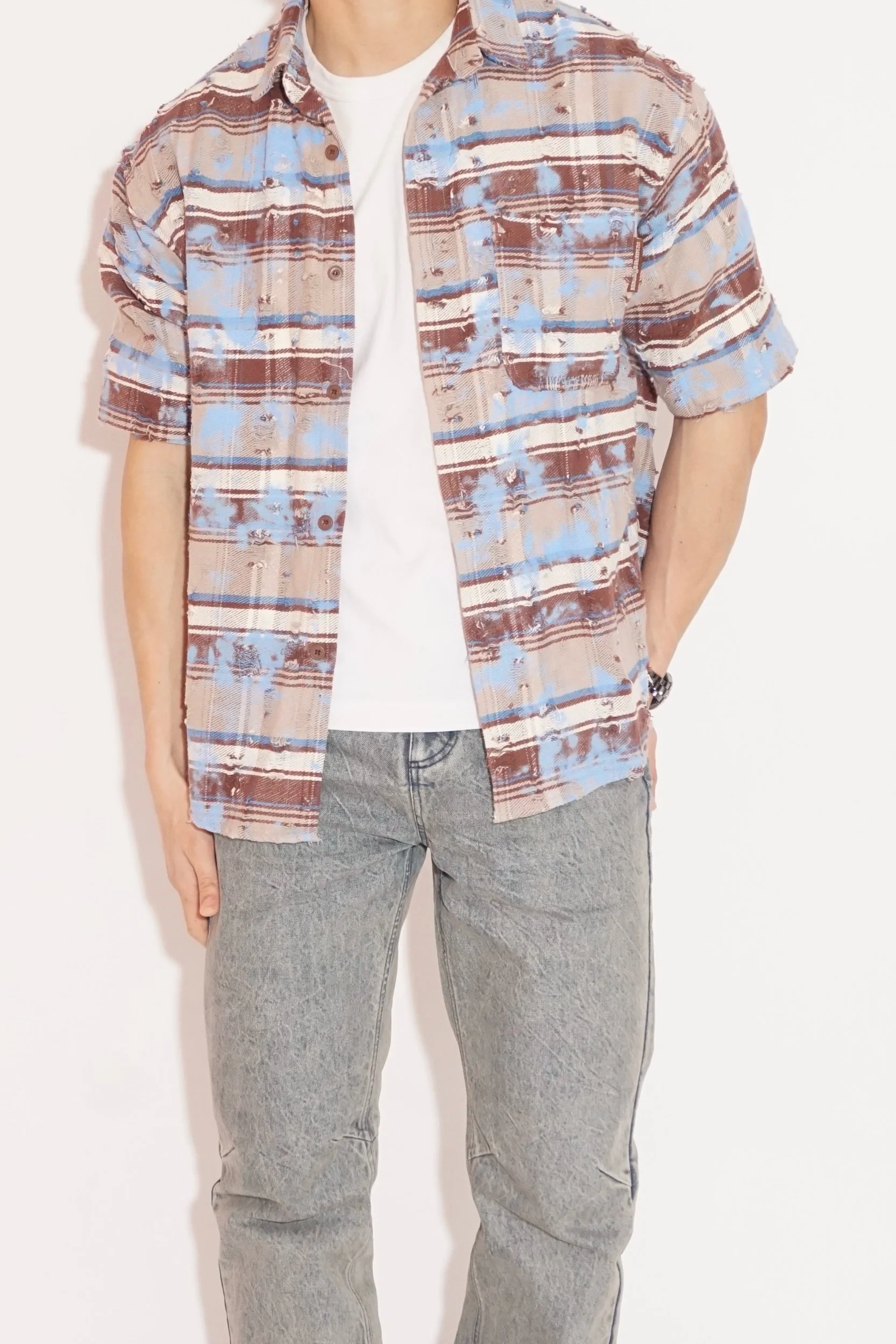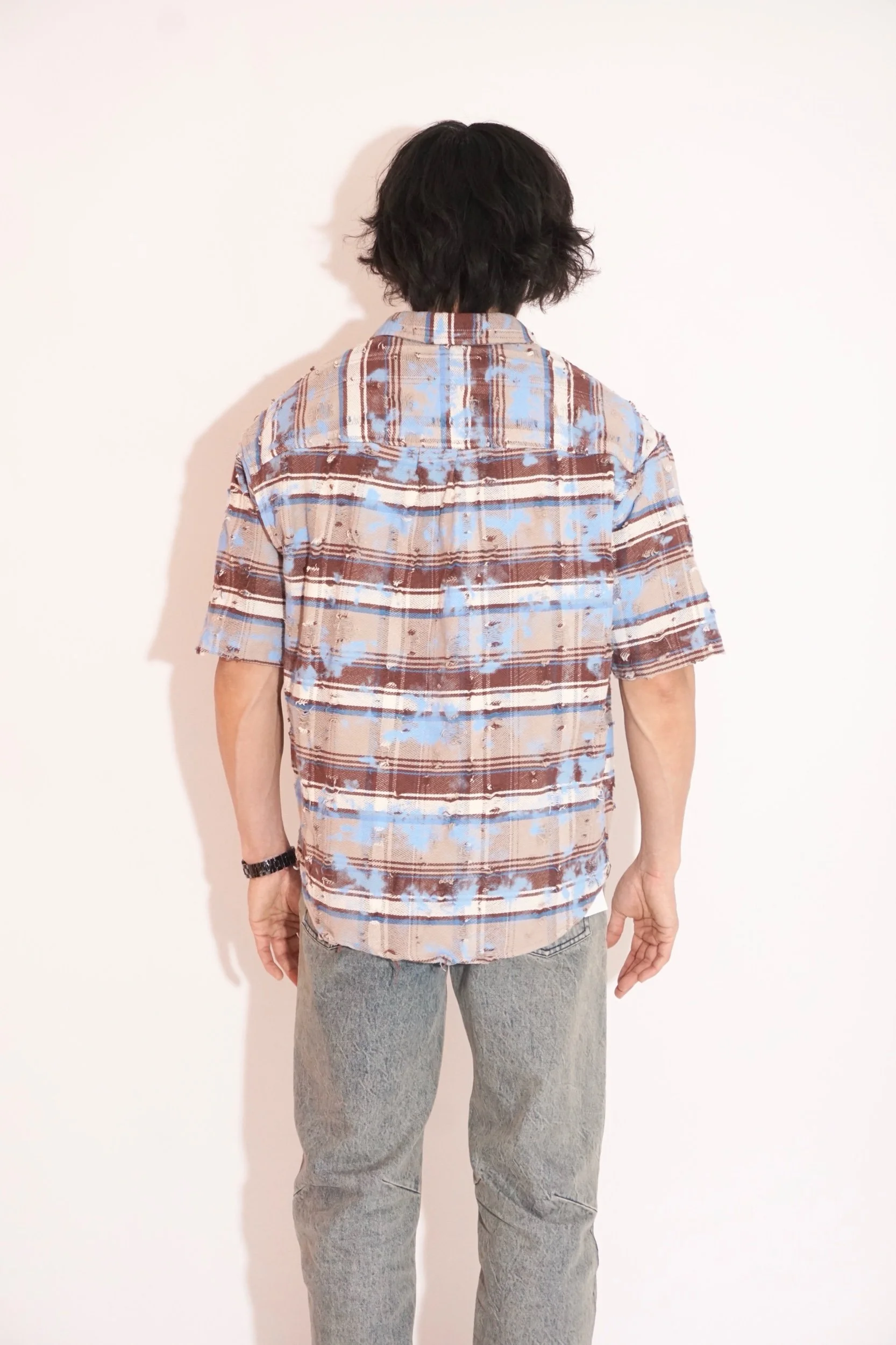 The shirt features a unique distressed wash, giving it a worn-in look that reflects a sense of adventure and spontaneity. Its rich blue hue adds a vibrant touch while maintaining a neutral elegance suitable for both casual and semi-formal occasions.